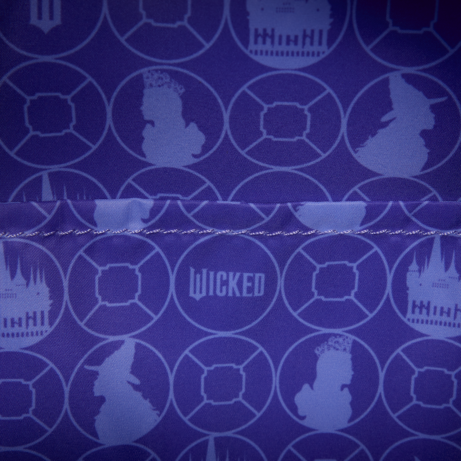 This mini backpack is sure to change your wardrobe for good! This bag celebrates Glinda and Elphaba on either side. You'll find embroidered details inspired by both characters on either side of the front of the bag, along with embossed details and gold beads. One side pocket is green lace, and the other is purple lace the straps feature the same color divide, too. Front and center is a 3D molded metal rivet featuring the silhouettes of Glinda and Elphaba. You'll also find a 3D bow handle for an extra sweet detail! For any Wicked fan that wants to celebrate their fav duo, this bag is for you!