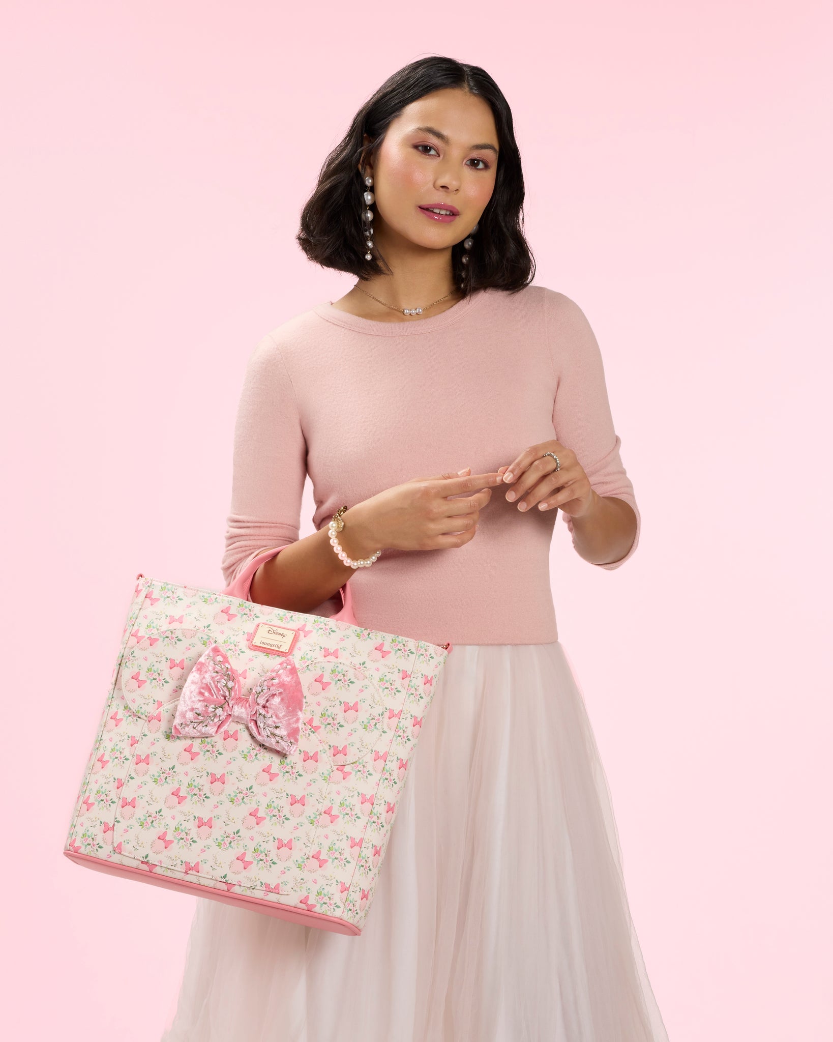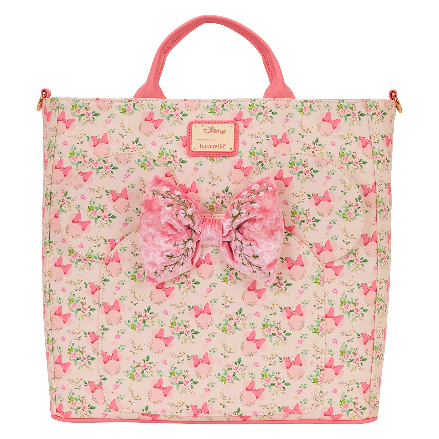 All over, you'll find a print of Disney Minnie Mouse's silhouette surrounded by floral designs. On the front, you'll find applique Minnie Mouse ears with a velvet bow in the center. This bag transitions easily from a backpack to a tote bag, so you can switch up your look however you'd like!