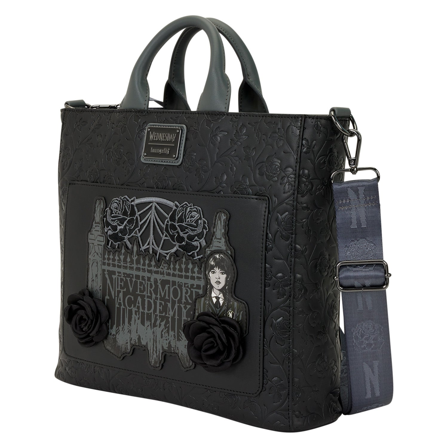 Now you can incorporate some Wednesday style into your look every day! This tote bag converts between a tote and a backpack, so you can carry your essentials however you'd like! You'll find Wednesday standing in front of the gates of Nevermore Academy on the front of the bag. You'll find 3D roses, and embroidered and embossed details on the bag.. Rep your fav show all day, every day with this tote!